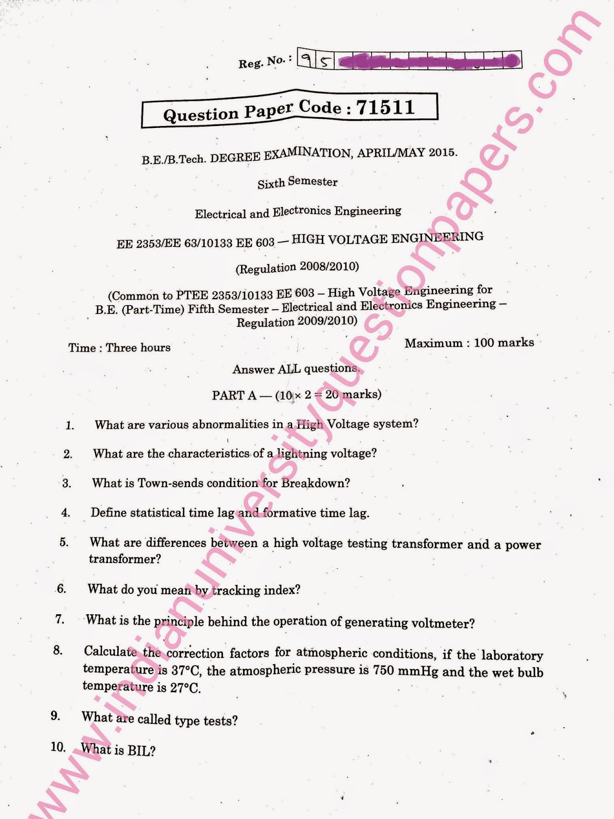 Searching for EE2353 High Voltage Engineering 2015 question paper? Here's attached a recent question of EE2353 for which the exam was conducted on 9th May 2015, Saturday by Anna University Chennai. This EE2353 question paper is for even semester 6th semester degree examination in Electrical and Electronics Engineering. The question paper code is 71511. See more details in the scanned copies of original EE2353 question paper and download it for your upcoming exams. This question paper is also common for 10133 EE 603 High Voltage Engineering for B.E Part-Time 5th semester regulation 2009 and 2010 students. R-2008 and 2010 is applicable for regular examinations of EE 2353 High Voltage Engineering in sixth semester EEE.