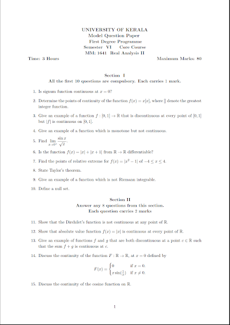 PDF Download: Click Here to download Kerala University B.Sc Real Analysis II 2016 Question Paper in PDF