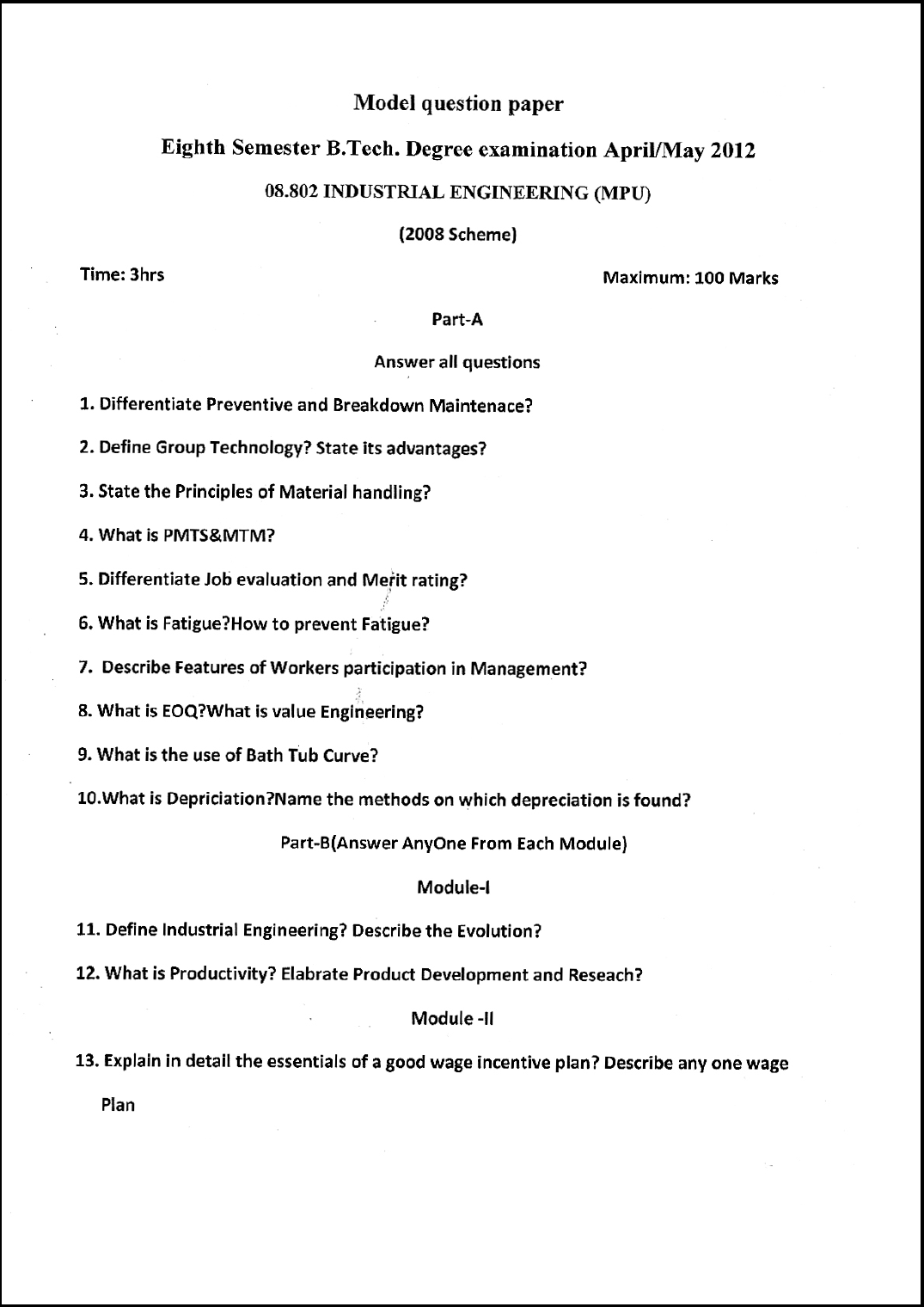 PDF Download: Click Here to download Kerala University B.Tech Industrial Engineering (MPU) April May 2012 Question Paper in PDF