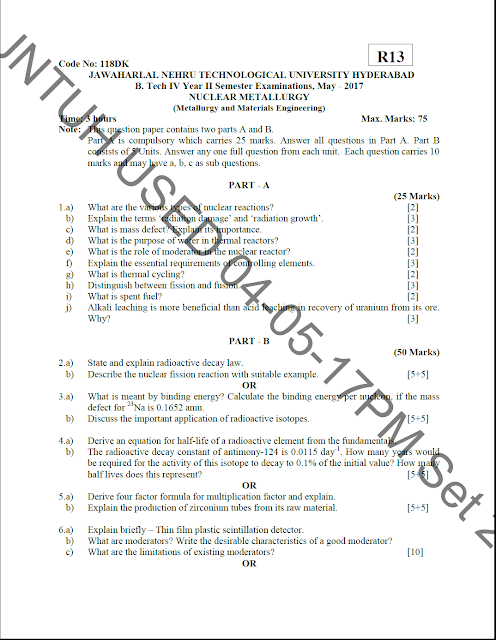 Attachment in PDF: Click Here to download JNTUH B.Tech nuclear metallurgy May - 2017 Question Paper