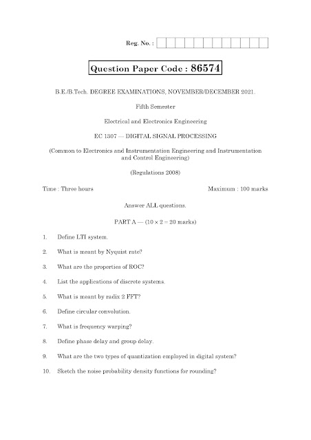 Attachments and PDF Link: Click Here to download Anna University EC 1307 — DIGITAL SIGNAL PROCESSING For Electrical and Electronics Engineering November/December 2021