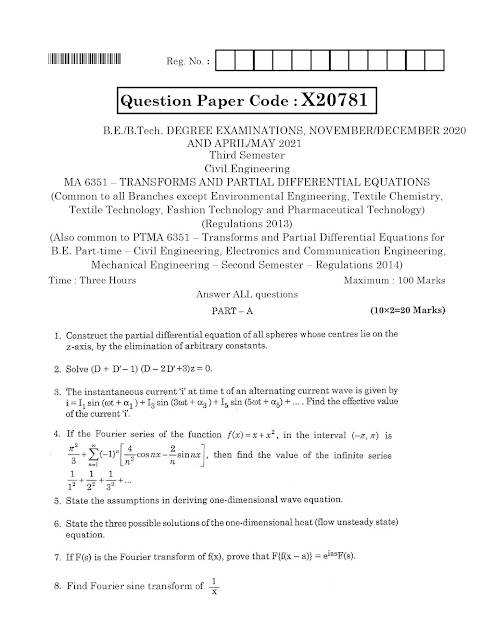 Attachments and PDF Link: Click Here to download Anna University MA 6351 – Transforms and Partial Differential Equations For Civil Engineering November/December 2020 and April/May 2021