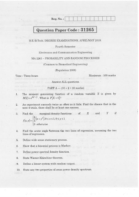 Attachments and PDF Link: Click Here to download Anna University MA 2261 - Probability and Random Processes For Electronics and Communication Engineering April/May 2019