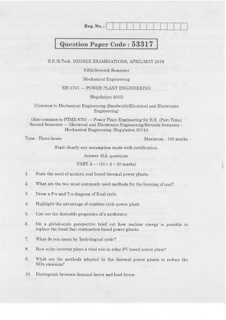 Attachments and PDF Link: Click Here to download Anna University ME 6701 - Power Plant Engineering For Mechanical Engineering April/May 2019