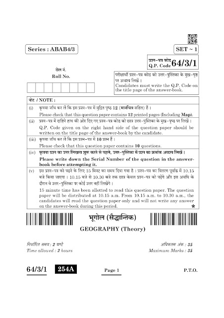 Attachment in PDF: Please Click Here: Central Board of Secondary School - Class XII (Geography) Theory Set 1 Question Papers (Examination 2022) Series - ABAB4/3