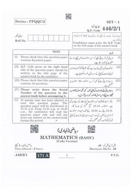 Attachment in PDF: Please Click Here: Central Board of Secondary School - Class X (Mathematics (Basic)) (Urdu Version) Set 1 Question Papers (Examination 2022)