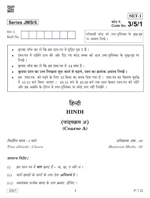 Attachment in PDF: Please Click Here: Central Board of Secondary School - Class X (Hindi (Course A)) Set 1 Question Papers (Examination 2019) Series - JMS/5
