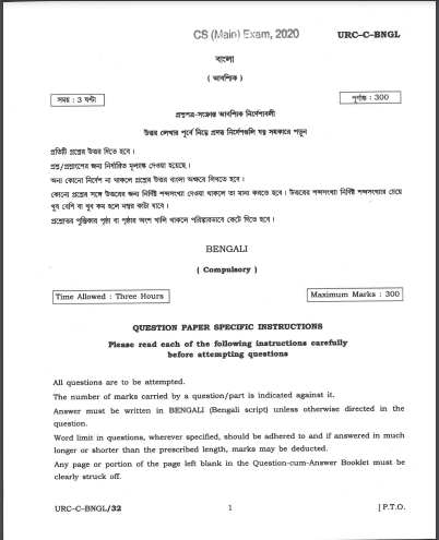 Click to here download:- Union Public Service Commission- Civil Service main Examination, 2020 Bengali Compulsory 2020 Question PaperScanned Copies: